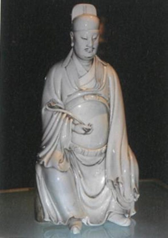 何朝宗留存于后世的作品寥若星辰,德化縣陶瓷博物館收藏的何朝宗瓷塑作品《文昌帝君》與《祥云觀音》即為其二。在“明代白瓷·獨樹一幟”展廳,鎮(zhèn)館之寶祥云觀音像,通體泛牙白色,線條清秀婉轉(zhuǎn),自如流暢;觀音頭披巾幔,腳踏祥云,面露慈悲,略略俯首,狀若普度世間眾生,令觀者心生敬愛。僅一尊觀音像,盡顯何朝宗的瓷塑功力。