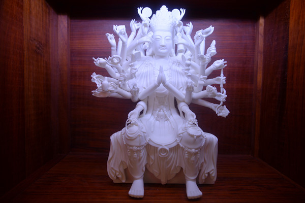 復(fù)制的故宮文物,包括已經(jīng)走上“中國名片”《中國陶瓷——德化窯瓷器》特種郵票的“白釉夔龍紋雙耳三足鼎”“白釉象耳弦紋尊”“白釉觀音坐像”和“白釉達(dá)摩立像”,還有“送子觀音”“阿彌陀佛坐像”“千手觀音”“釋迦牟尼佛坐像”等白瓷珍寶。