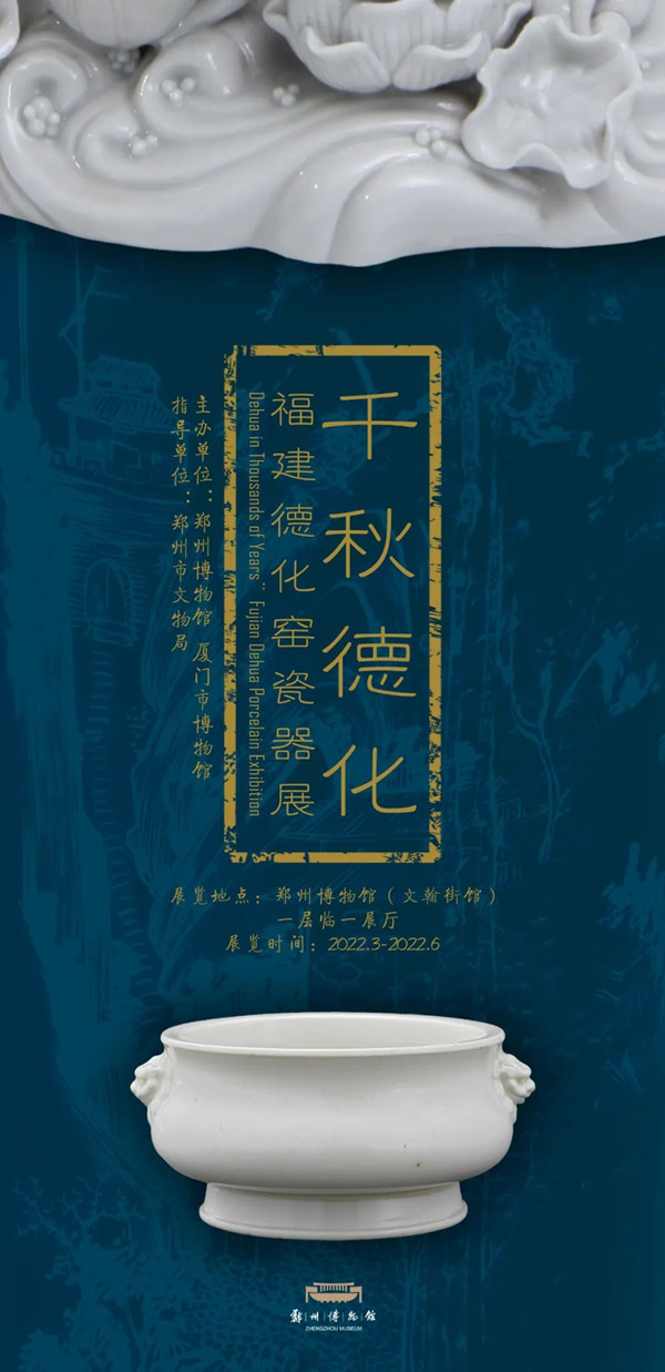 《千秋德化——福建德化窯瓷器展》由鄭州博物館、廈門市博物館主辦,遴選德化瓷精品124件(套),包含白瓷、青花瓷、醬釉、彩瓷,其中以白瓷為主;品類豐富,包含生活用具、文房用具、陳設器及各類塑像。通過“延燒千載 浮槎萬里”“瓷國明珠 天下共寶”“千秋瓷業(yè) 歷久彌新”三個部分,全面展示德化窯作為一個以外銷為主要生產方向的民間窯場的發(fā)展歷程、 魅力特征及其強大生命力。