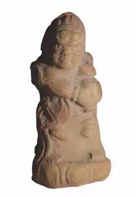 如圖所示這件宋代泥塑玩具,亦較為特殊,題材為昆侖奴懷抱花瓶,高約7、寬2.5厘米,站姿微屈,表情憨厚,模制燒成。此件玩具從線條到整體布局、從著裝到頭飾發(fā)型、從體態(tài)到神態(tài)情感縱然一體,惟妙惟肖。
