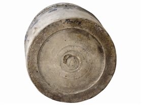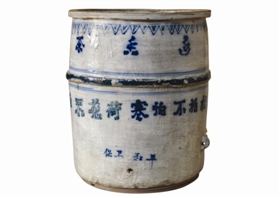 該物器型的造型略顯拙樸,地方色彩濃厚。由于器型之大,在燒制的過程中增加了技術(shù)難度,以致在器體出現(xiàn)了部分脫釉的瑕疵。因?yàn)樗菍?shí)用器,屬公共場(chǎng)合置放之物,在人們的頻繁使用中損傷也是在所難免的,在該桶沿處有磕碰、殘損、裂紋,在桶的下方左右四個(gè)耳系殘缺了三個(gè)。其他部位完好,不妨礙整體鑒賞效果。該茶水桶器體上的字體書寫風(fēng)格比較隨意,例如“能”字只書寫右半邊,若單獨(dú)出現(xiàn)是很難辨讀的,這與當(dāng)時(shí)技工的書寫習(xí)慣有關(guān),字體書寫水平一般,這在當(dāng)時(shí)全國(guó)文盲率高達(dá)90%以上的國(guó)情來說,是情有可原的。姑且不言工匠的藝術(shù)功底高低,因?yàn)檫@些已顯得并不那么重要了,重要的是器物在缸體上反映的文字信息,就足以令人驚嘆。制作者的創(chuàng)意已充分顯示出,那一時(shí)期的干部工人和全國(guó)的翻身人民一樣,他們?cè)邳h的正確領(lǐng)導(dǎo)下,滿懷激情地投身于新中國(guó)的經(jīng)濟(jì)建設(shè)之中,把對(duì)黨的無比熱愛之情躍然在器身之上,這才是創(chuàng)意和制作者所賦予該茶水缸的初心內(nèi)涵亮點(diǎn)。
