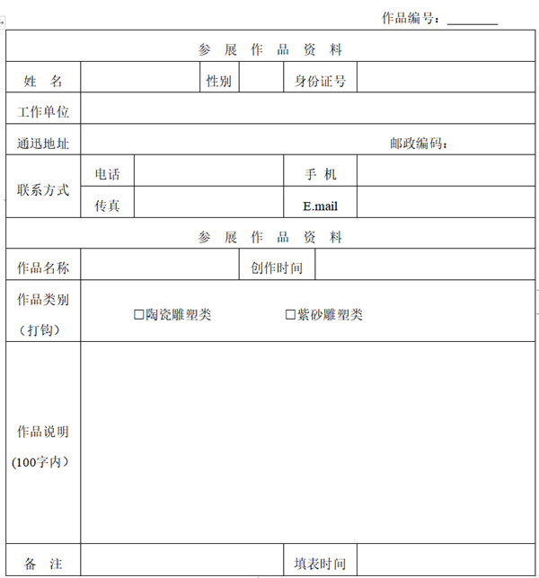 1.每件(套)作品需單獨填寫參評表;2.每件(套)作品的作者一般不超過2人;3.寄送表格時需附作品高像素照片;4.此表請于2020年5月22日前發(fā)送至157256839@qq.com,實物作品于2020年5月28日送到德化縣陶瓷博物館二樓,逾期不再接收。