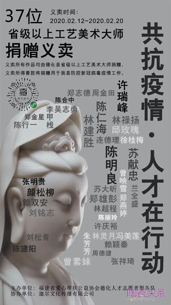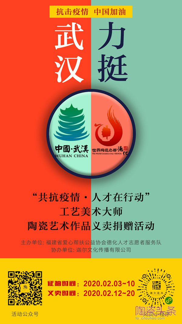 國難當頭,匹夫有責。此時不“起而行”,更待何時?為此,由福建省愛心幫扶公益協(xié)會德化人才志愿者服務(wù)隊發(fā)起,迦爾文化協(xié)辦,向德化縣省級及以上工藝美術(shù)大師征集陶瓷藝術(shù)作品進行義賣,義賣所得善款將捐贈用于德化縣防控新冠病毒疫情工作。發(fā)起此次藝術(shù)品捐贈義賣的倡議,并為義賣公益活動命名為“共抗疫情·人才在行動”,活動號召藝術(shù)界同仁集聚力量,為抗疫盡一份我們應(yīng)盡的責任和義務(wù)。
