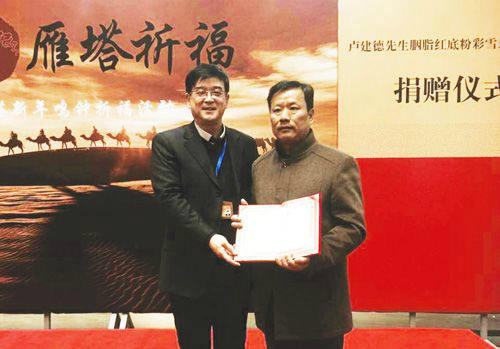 鐘聲悠揚(yáng)回蕩夜空,古都長(zhǎng)安燈火通明。2016年12月31日,世界歷史文化名城西安在千年歷史遺址小雁塔下舉行了敲鐘祈福迎新年活動(dòng)?;顒?dòng)開(kāi)始前,西安市文物局領(lǐng)導(dǎo)向前來(lái)參加活動(dòng)的西安市民隆重推介了來(lái)自世界瓷都——景德鎮(zhèn)的工藝大家盧建德先生和他捐贈(zèng)給國(guó)家一級(jí)博物館西安博物院的胭脂紅地粉彩雪景薄胎大碗。捐贈(zèng)作品一亮相,博得了廣大西安市民的熱烈掌聲。