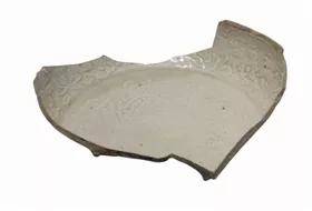 2009年,河北省文物研究所和北大考古文博學(xué)院組成聯(lián)合考古發(fā)掘隊(duì),對(duì)定窯遺址展開第三次主動(dòng)考古發(fā)掘,其間發(fā)現(xiàn)迄今結(jié)構(gòu)保存最完整的窯爐、最早的“尚食局”款瓷器等,確定了定窯的“皇家”血統(tǒng)。此件白釉印花龍紋盤殘片屬此次發(fā)掘的成果之一,出土于曲陽(yáng)縣澗磁村定窯遺址。