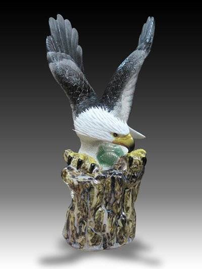 這里不是浩瀚荒漠,也不是高山草原;這里沒有參天古木,也沒有碧海藍(lán)天;然而卻有鷹——形態(tài)迥異、羽色不同的鷹——瓷鷹。它們或斂翅而棲,或展翼而飛,或昂首摩云,或俯視擒物??茨谴生?,取之聳身待起的瞬間姿態(tài),嘴鉗劍戟,爪握刀錐,那狀如猢猻的眼睛側(cè)目而視,分明透出機(jī)警、敏銳的光亮。整個(gè)造型刀法細(xì)膩傳神。其線條流感中隱藏著無窮的韻律,活現(xiàn)出杜甫詩中“竦身思狡兔,側(cè)目似愁胡”的意境。這就是中國陶瓷藝術(shù)大師聶樂春的鷹世界。
