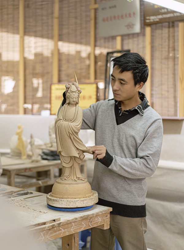 周德健承續(xù)家學特色,專于百態(tài)濟公的創(chuàng)作,“會動的舌頭”是他最大的亮點之一,每一位見過周家濟公的人無不被這巧妙的舌頭設計吸引。盧美彬寄情山水畫創(chuàng)作,他用釉下五彩或釉上瓷彩將國畫與瓷有機結合,講究構圖韻味。筆下的瓷彩山水,氣勢恢宏,雄秀壯闊,浸透著名山大川的秀美神韻和大自然的奇幻靈動。賴瑞攀專注于觀音等傳統(tǒng)佛像題材的創(chuàng)作,擅長將傳統(tǒng)工藝與現代審美巧妙融合,創(chuàng)作出有自身符號特色的手藝作品,展現出傳統(tǒng)手藝人繼承傳統(tǒng),推陳出新的創(chuàng)作理念。邱桂還繼承傳統(tǒng)工藝,探索瓷藝新表達,作品涉獵日用茶具、工藝瓷雕、立體瓷板雕等,工藝精湛,表達新穎,彰顯出新一代手藝人的創(chuàng)新思維。陳碧珍從瓷塑轉入顏色釉作畫,將傳統(tǒng)雕塑與瓷畫裝飾工藝玩出新花樣,或抽象,或具體。創(chuàng)作的作品給人無限的遐想與隨心所欲的感覺。