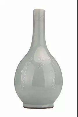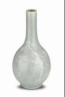 山東省青州市博物館所藏清乾隆豆青加粉梅竹二友天球瓶(見圖),口徑4.8、高40.6、底徑12.6厘米。1964年從山東省益都縣出口公司揀選。直口,圓唇,細(xì)長頸,溜肩,球形腹,圈足。頸上有多處開片紋飾,腹部主題紋飾為浮雕梅竹圖:在一枝盤折曲伸的老枝上,開著幾枝大朵梅花。一叢翠竹飄曳在微風(fēng)中,并有題詩“材大可同天地老,色堅不畏雪霜寒”。構(gòu)圖疏秀有致,使整個畫面得到統(tǒng)一。器體施豆青加粉釉,器內(nèi)及底施白釉,并有幾處縮釉點。