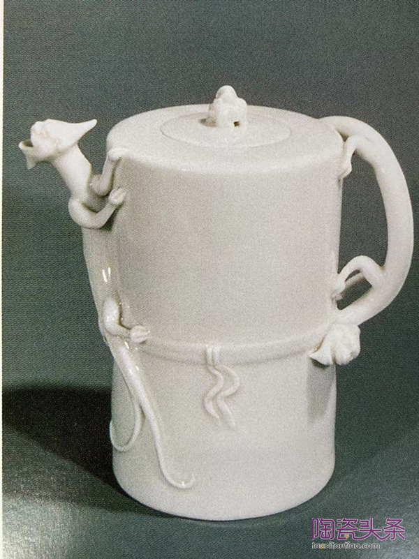Such a piece indicates standards of quality in the late Ming that Donnelly would have been reluctant to concede; he would no doubt, however, have been even more astonished by the dragon-handled wine-pot The Victoria and Albert Museum has one of similar design(Fig. 9)and in rather better condition, the Hatcher one having suffered somewhat from its long stay on the seabed. This item appears as No. 2 in the Dresden inventory of tea things; although in China it was probably intended for wine. Intriguing, also, is the appearance of an unfamiliar form of Dehua teapot- rather tub-shaped with a wide mouth, flat lid and small sloping spout(Fig. 10): this somewhat resembles a form found in early Yixing wares. The first known blue-and-white teapots are apparently those found in this same wreck. Another form of small wine-pot, with bam- boo-stvle ribbed sides, that adds interestingly to the repertoire also occurred in the wreck.There is one in the Victoria and Albert Museum very like it, but of rather better quality. Relevant factors in identifying the mid-seventeenth century types of blanc de Chine remain firstly the material itself, which is repeatedly of fine, ivory-like quality, and usual an altogether thicker and stronger style of potting, noticeable especially in the handling of the foot.
