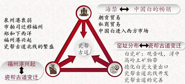 德化窯作為典型的外銷瓷窯口,它的“瓷幫古道”隨著宋元時期泉州港的興盛、明代福州港的發(fā)展、清代廈門港的興起而有所變化。
