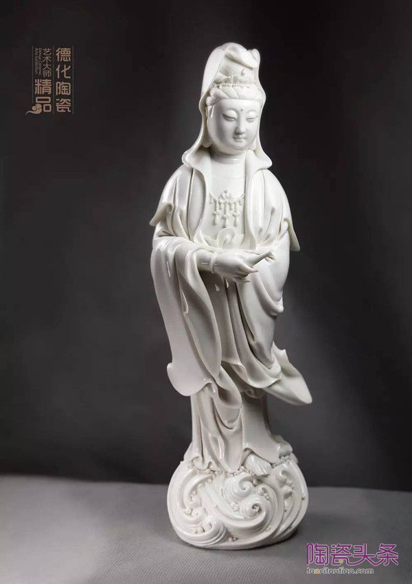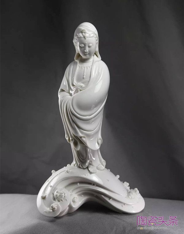 尤其是明代的何朝宗吸取了唐代佛像繪畫大師吳道子的作風(fēng),使瓷觀音的塑造更加形象豐滿,雍容大方,瀟灑脫俗,美妙絕倫。其所作瓷觀音,身姿頭部略微側(cè)轉(zhuǎn),富有動(dòng)態(tài)變化,五官頭發(fā)刻畫精細(xì),雙眼瞼上兩條彎彎的線條從印堂逐漸收縮下延至鼻端。既顯示了慈和的雙眉又畫出了端正的鼻棱,同時(shí)也保留了傳統(tǒng)佛像的雕刻韻味,衣紋線條的處理采用松緊、對(duì)比、均衡、反復(fù)的手法,疏密有致、長(zhǎng)短交替、粗細(xì)相宜、明暗起伏、圓轉(zhuǎn)流暢、主次分明、繁而不亂;衣巾邊緣薄利,反轉(zhuǎn)流利活潑,具有舒展、飄逸的輕柔質(zhì)感;手的制作采用捏塑,手指纖秀。形狀優(yōu)美;珠串、花朵、瓔珞的捏制工細(xì)逼真。經(jīng)書、凈瓶配置得當(dāng);就是巖石、海云、蓮花的托座,雕刻也力盡工細(xì),巖石似溶巖錘乳,造型奇巧,玲瓏剔透;海水則浪花翻卷,水珠疊濺;蓮花則寫實(shí)逼真,枝葉宛然。整體的精細(xì)雕刻,形如一幅素雅、簡(jiǎn)潔的工筆白描。巧妙的造型設(shè)計(jì),精細(xì)的雕刻工藝結(jié)合潔白明凈,如脂似玉的瓷質(zhì),形成了德化瓷觀音的獨(dú)特風(fēng)格,突出了雕塑美和材質(zhì)美,使瓷觀音益見精美傳種,動(dòng)人心扉,成為中國(guó)工藝美術(shù)中異彩奪目的明珠。