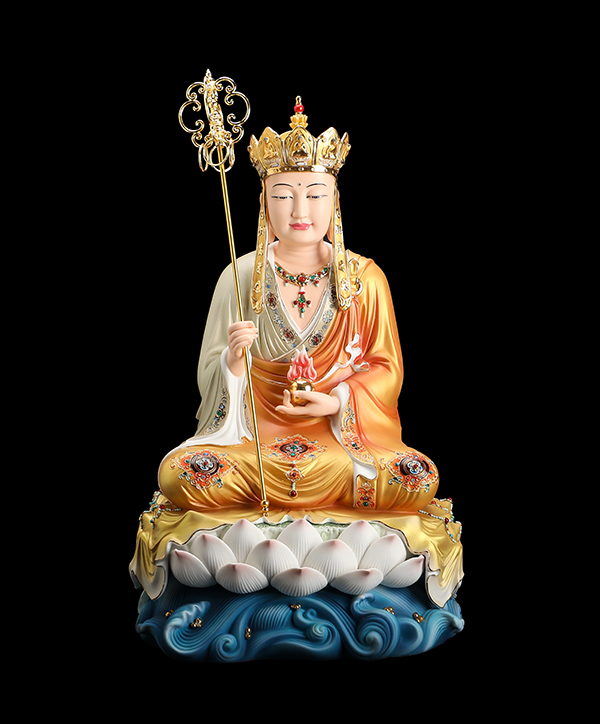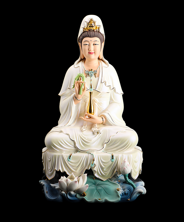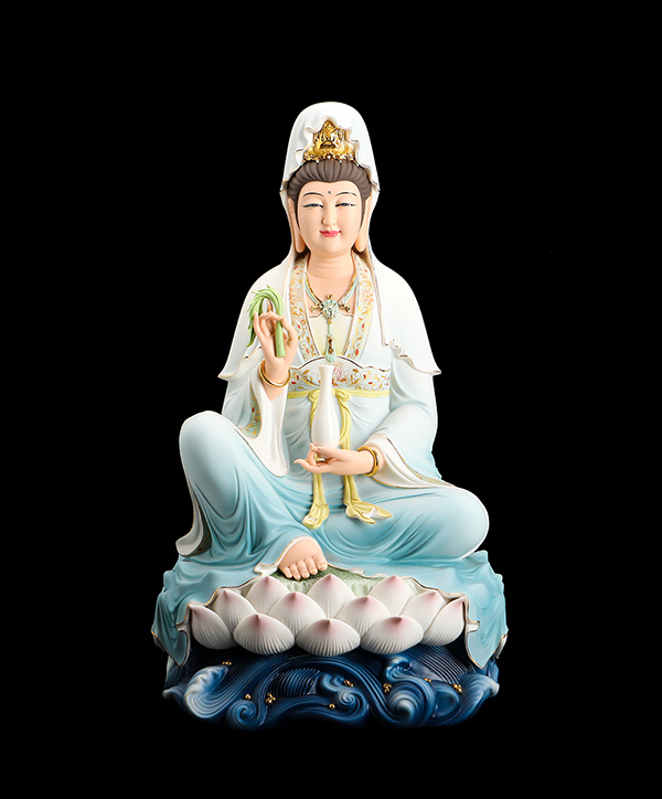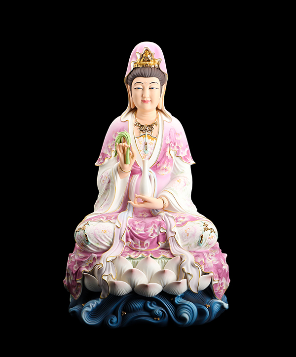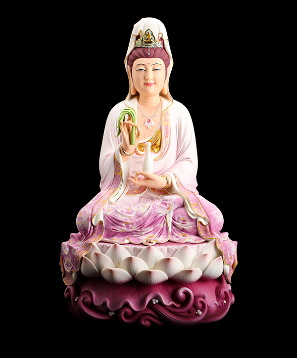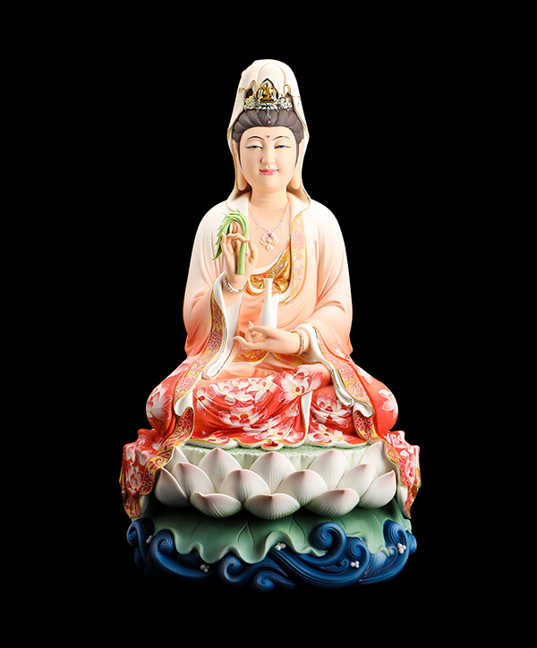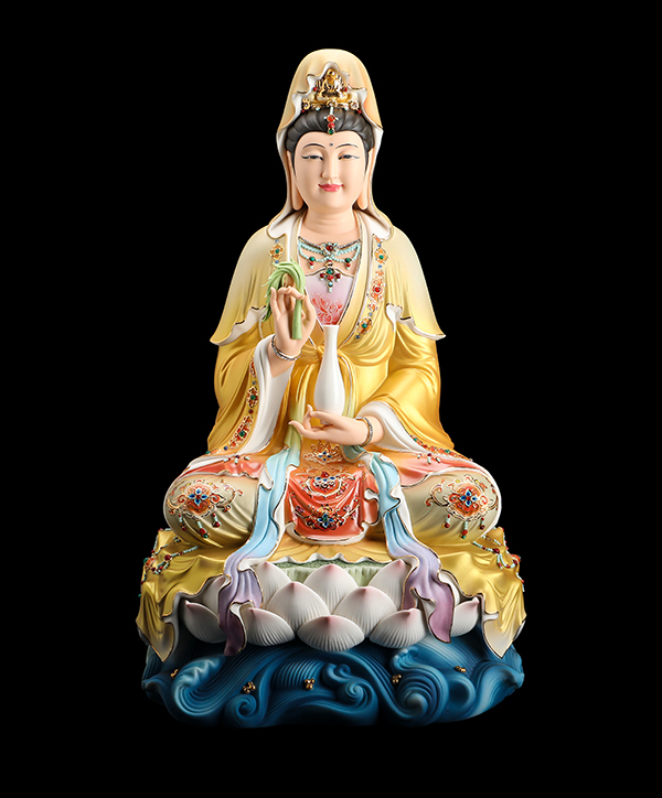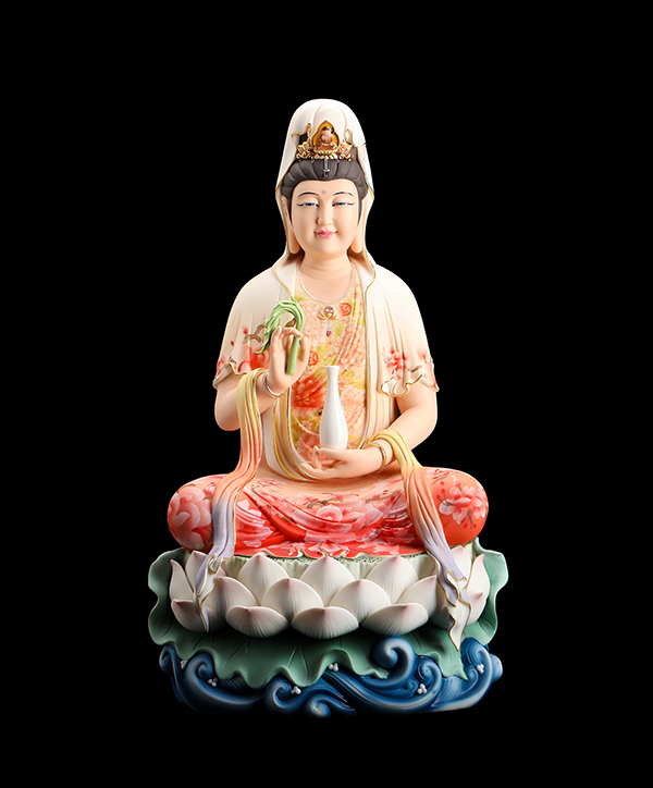 他的觀音手持凈瓶,面相四方,慈眉善目端坐于蓮花寶座上。紅與黃交織在一起的清雅色系搭配,純手工繪制的蓮花點綴于衣裳,描金的瓔珞上鑲嵌著鉆石,盡顯雍容華貴。而立體的蓮花座與海浪設(shè)計,特別是垂落于蓮花座上的衣裳,隱約可見花瓣的紋理,讓作品更顯完美。
