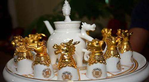 “貴妃醉酒”酒具由“貴妃醉酒”分酒器和“圓明園十二生肖獸首酒杯”組成。出身高貴,融合宮廷文化,白瓷藝術(shù)文化和中華酒文化于一體,做工極其精細(xì)、用料達(dá)到極致。徐朝貴說:“一件作品,必須要有思想、有靈魂。每一個(gè)人在一件雕塑面前,如果能做到和這件藝術(shù)品的共鳴,那這件作品就是成功的作品?!F妃醉酒’酒具就是我傾心打造的這樣一件作品?!?