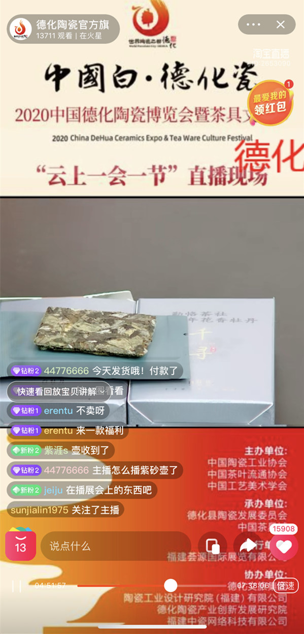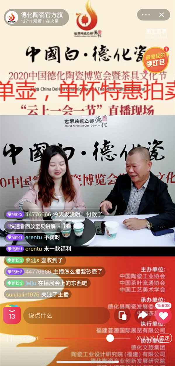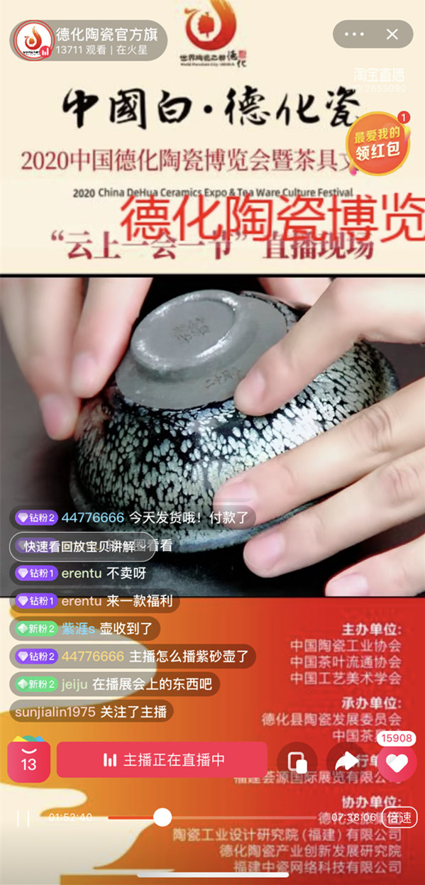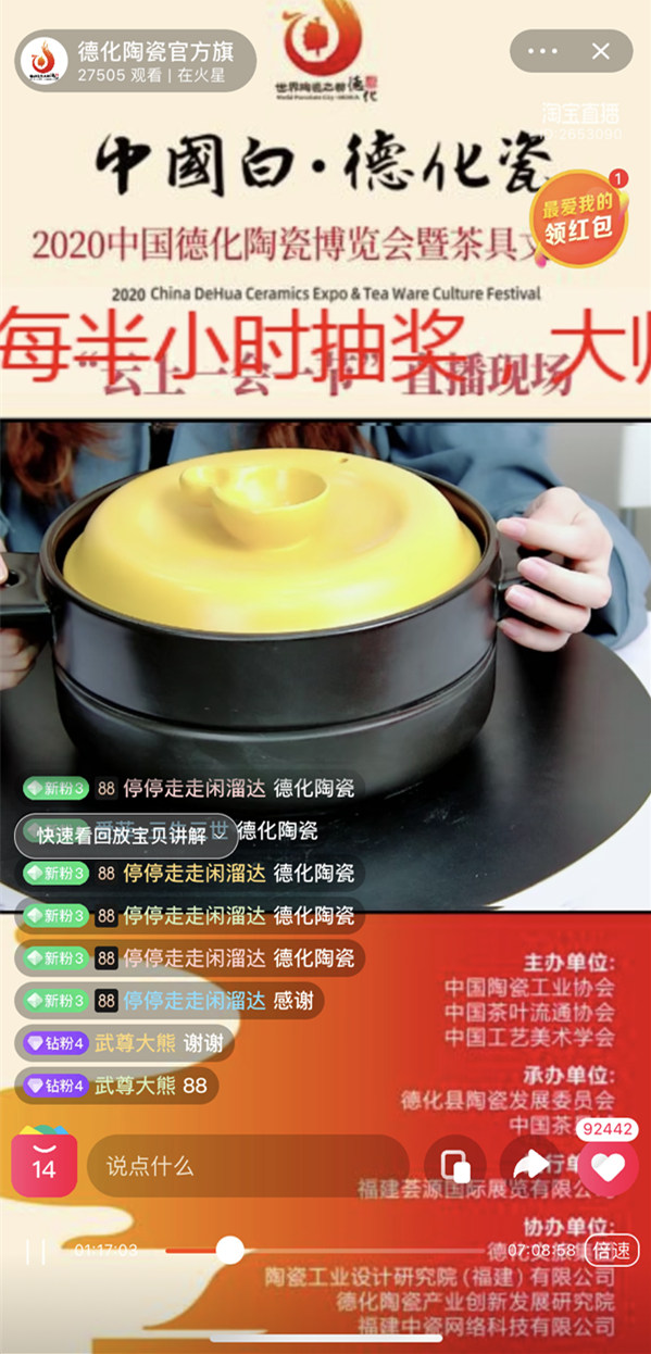 展會現(xiàn)場直播間邀請參展企業(yè)參與直播,推出各項吸睛優(yōu)惠活動,調(diào)動線上網(wǎng)友參與到“一會一節(jié)”的盛宴中來,促進德化陶瓷品牌的進一步推廣和傳播。據(jù)統(tǒng)計,展會期間參展企業(yè)直播場次達(dá)百場,直播總瀏覽量86萬人次,同時場外陶瓷文化館、出口工藝館及平臺商家直播場次70余場,實現(xiàn)“百商聯(lián)播”的云帶貨盛景。