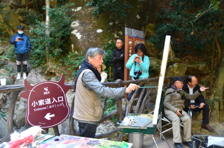 在石牛山景區(qū),范迪安手持畫筆,一筆一筆將岱仙瀑布的美景繪至畫布上,取石牛山、瀑布水,把對(duì)油畫本體語(yǔ)言的研究與寫意的方法有機(jī)結(jié)合起來(lái),在畫布上,他從調(diào)配色彩到構(gòu)圖造型,自在如行云流水,落落大方,繪制出一幅令人連連稱絕的岱仙瀑布圖。