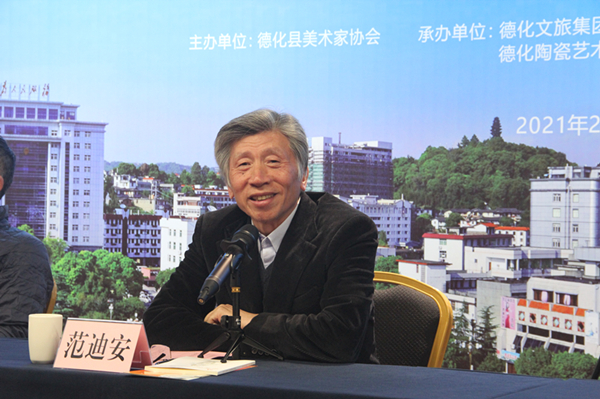 活動(dòng)期間,范迪安應(yīng)邀作了主題為“建立瓷之都的世界格局 走當(dāng)代傳承創(chuàng)新之路”的分享,吸引了德化縣陶瓷藝術(shù)大師、新秀代表、美術(shù)家等上百人到場(chǎng)交流?!耙訄?jiān)定推動(dòng)德化陶瓷傳統(tǒng)的研究和傳承,要通過(guò)感受時(shí)代的變遷來(lái)把握德化陶瓷的創(chuàng)新,要對(duì)德化陶瓷藝術(shù)和陶瓷產(chǎn)業(yè)在更大范圍進(jìn)行推廣和傳播?!狈兜习舱f(shuō),今天是個(gè)信息時(shí)代,對(duì)德化陶瓷來(lái)說(shuō)機(jī)遇挑戰(zhàn)并存,要利用好各種機(jī)會(huì)和平臺(tái)進(jìn)一步推動(dòng)陶瓷文化傳播,全力推動(dòng)陶瓷文化的傳承和影響力。德化陶瓷文化影響力增強(qiáng)后,也可以吸引全國(guó)各地更多藝術(shù)家來(lái)到德化,通過(guò)陶瓷這種媒介來(lái)實(shí)現(xiàn)作品創(chuàng)作,無(wú)形中它就構(gòu)成一種更加豐富的多元的多樣的學(xué)術(shù)生態(tài)。