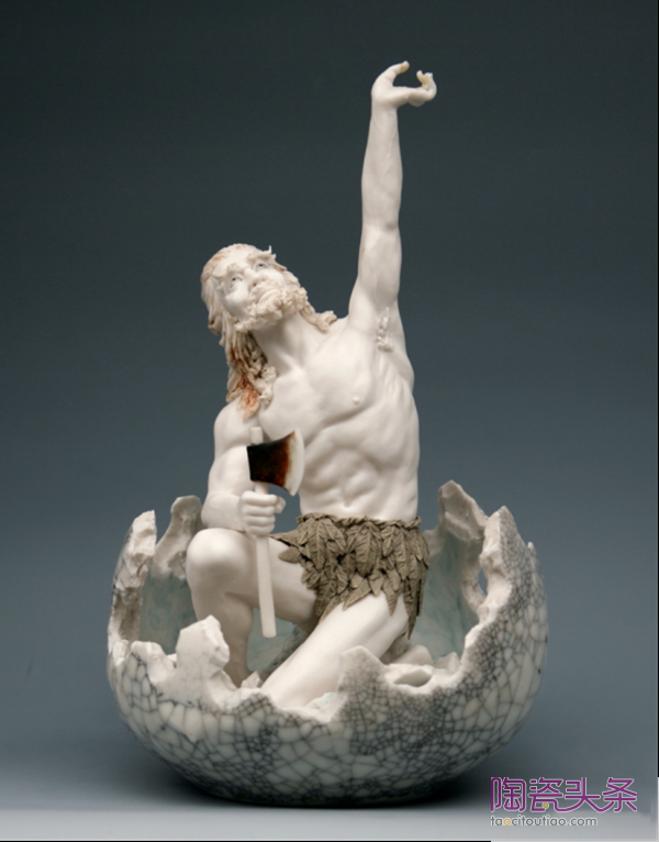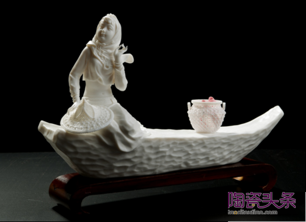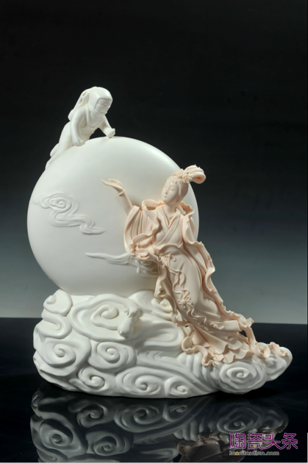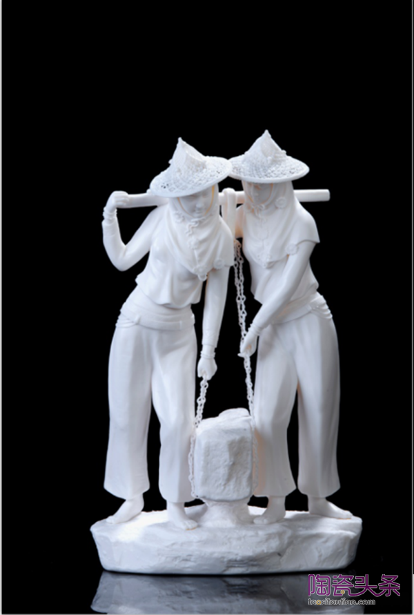 在分析學(xué)習(xí)德化白瓷經(jīng)典作品方面,明良極其下功夫。他悉心體會前輩傾注于燒造工藝的匠心,不斷改良優(yōu)化胎釉配方,成功研制出“象牙白”“豬油白”“蔥根白”“孩兒紅”等傳統(tǒng)瓷質(zhì)釉色,同時(shí)還創(chuàng)造性地?zé)瞥晒Α吧汉骷t”等新品。立足于工藝正統(tǒng)的恪守傳承,明良也在塑造方面刻苦鉆研,不斷探索出新之道。多年來,他輾轉(zhuǎn)中央工藝美院陶瓷雕塑設(shè)計(jì)系、清華大學(xué)美術(shù)學(xué)院工藝美術(shù)系、中國藝術(shù)研究院等高校學(xué)府研修學(xué)習(xí),虛心接受老師和同道的指點(diǎn),不斷拓寬、提高自己的人文視野和審美眼光。由此養(yǎng)成的豁達(dá)明睿,使他善于結(jié)合當(dāng)代藝術(shù)與技術(shù),靈活運(yùn)用“何派”技法,以至創(chuàng)作出一批獨(dú)具匠心、時(shí)代特色鮮明的優(yōu)秀作品。譬如,突破傳統(tǒng)體量的《千手觀音》,融入薪火意境的《千年窯火》,采用大寫意手法的《一葦渡江》,展現(xiàn)原生態(tài)粗獷之美的《盤古開天地》,融匯現(xiàn)代科技生活與古代神話的《相逢》,以及將時(shí)代文人氣質(zhì)融入文昌帝君形象的《志在書中》,等等。他還創(chuàng)作了一些直接反映當(dāng)代社會生活的瓷塑作品,如《恵女風(fēng)情》以寫實(shí)手法塑造了兩位惠安女形象,作者選擇抬石頭這一典型勞動場景,以生動洗練的姿勢把握和形態(tài)刻畫,表現(xiàn)了中國勞動?jì)D女勤勞樸實(shí)、吃苦耐勞的精神風(fēng)貌。作品上,采用瓷泥編織傳統(tǒng)技法塑造的鏈條、斗笠以及概括處理的傳統(tǒng)服飾,以強(qiáng)化的質(zhì)感和形式趣味增強(qiáng)了藝術(shù)感染力。明良設(shè)計(jì)創(chuàng)作的日用器具既有時(shí)代氣息又富材質(zhì)美感,即如為2017年廈門金磚會議所作珍貴國賓禮瓷《日光》,其得體的造型裝飾特別適合材料特性,彼此相得益彰的和諧關(guān)系更加突顯出德化瓷質(zhì)撼人心魄的精雅之美。