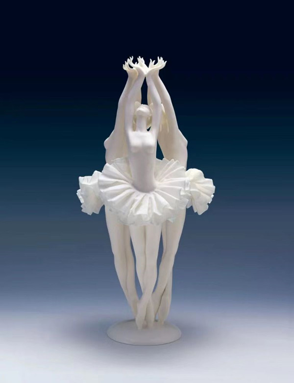 走進瓷藝城大師館,印入眼簾的便是中國工藝美術(shù)大師許興泰的白瓷作品《觀音頭像》,觀音頭梳發(fā)髻,經(jīng)過許興泰打磨的秀發(fā)紋理分明,細(xì)膩溫潤。另一處展柜呈現(xiàn)的《天鵝湖》由柯宏榮、陳桂玉共同創(chuàng)造,三位芭蕾少女踮起腳尖、高舉雙手,在渺渺樂曲中一展舞姿。邱雙炯制作的仕女持扇輕笑、神態(tài)嬌柔,她身著綾羅,瓷土燒制的裙擺皺褶如水波粼粼,仿佛當(dāng)真由綢緞編織而成……諸位大師作品齊聚一堂,無聲交談中,盡顯德化陶瓷美學(xué)魅力。