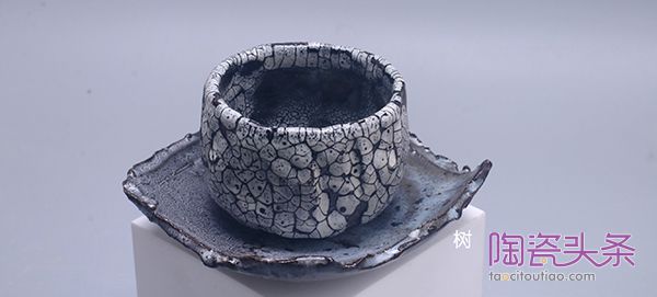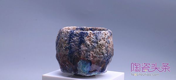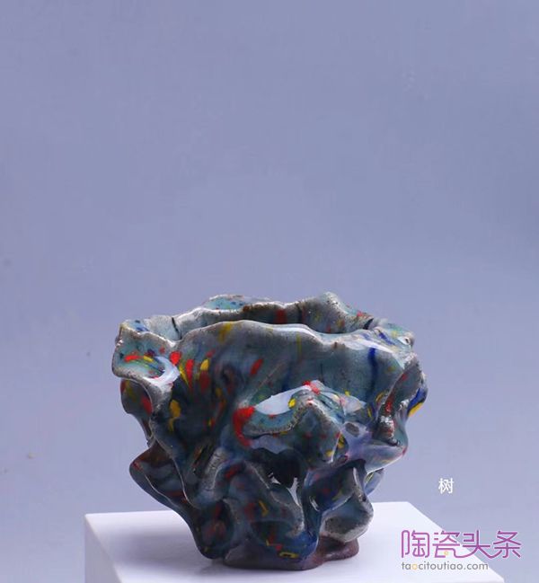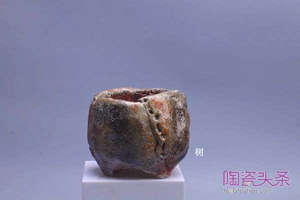 如作品《太湖志野杯》,太湖石狀的器身設(shè)計,使得器皿造型凹凸起伏,呈不規(guī)則狀。如隕石般墜落于器物表面的釉面肌理,讓器皿粗狂中帶著些許張揚。釉面上少許的色彩點綴,又讓器皿多了一份活力。