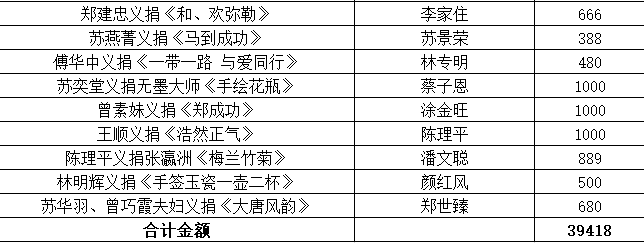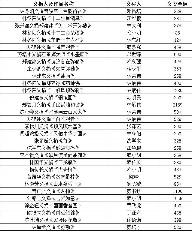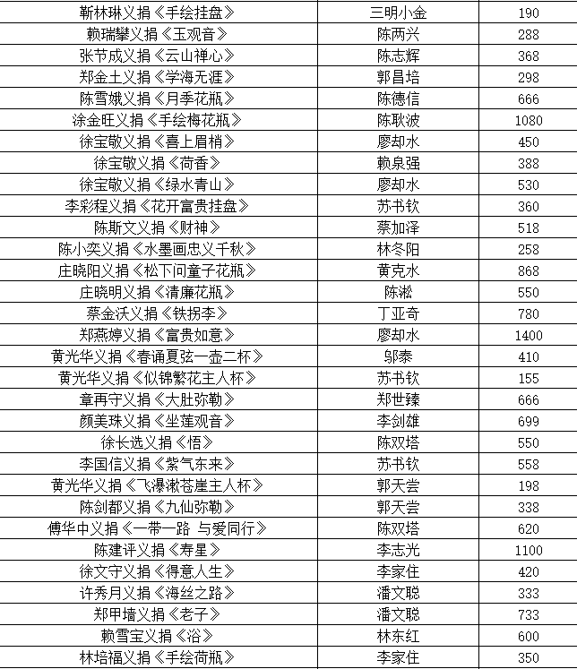 為弘揚“一方有難,八方支援“的大愛精神,助力新型冠狀病毒肺炎疫情防控工作,由福建省陶瓷行業(yè)協(xié)會主辦,德化縣工商聯(lián)(總商會)、德化縣陶瓷發(fā)展委員會辦公室協(xié)辦,世界瓷都戴云山藝術(shù)館承辦的德化陶瓷藝術(shù)品第一期義賣活動順利拉下帷幕。此次義賣(義捐)所得金額4.8184萬元全數(shù)捐贈我縣紅十字會,現(xiàn)將義賣(義捐)名單公示如下!