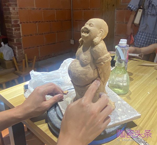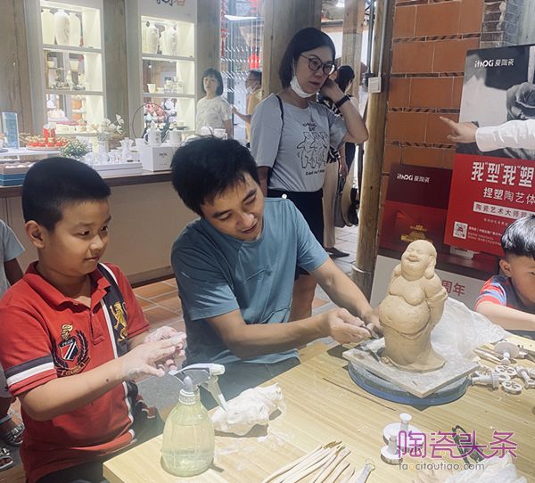 在創(chuàng)作體驗活動上,賴瑞攀老師帶去了一件彌勒佛泥稿,現(xiàn)場演示德化瓷塑雕刻技藝,引得往來旅客駐足觀看。興趣濃厚的小朋友還拿起泥巴,跟著賴瑞攀老師學(xué)做雕塑。他們發(fā)揮想象做各種各樣的造型,感受陶瓷文化的魅力。