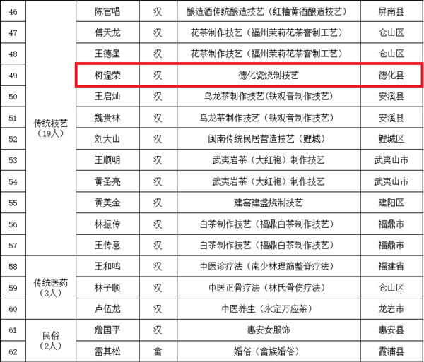 9月23日,福建省文旅廳網(wǎng)站發(fā)布公示,經(jīng)專家評審、評委會審議并報廳務(wù)會研究審定,提出了福建省第六批國家級非物質(zhì)文化遺產(chǎn)代表性傳承人推薦申報名單共62人,其中,德化縣柯宏榮(柯逢榮)上榜。