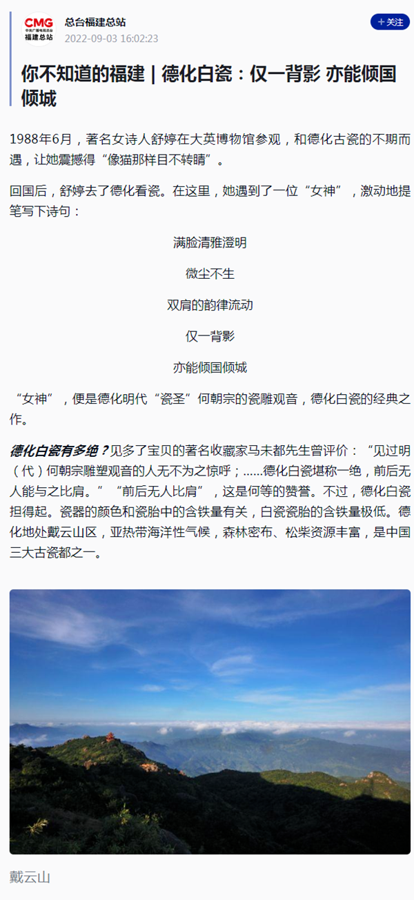 9月3日,央視新聞客戶端報道德化白瓷,刊發(fā)了《你不知道的福建 | 德化白瓷:僅一背影 亦能傾國傾城》圖文報道。