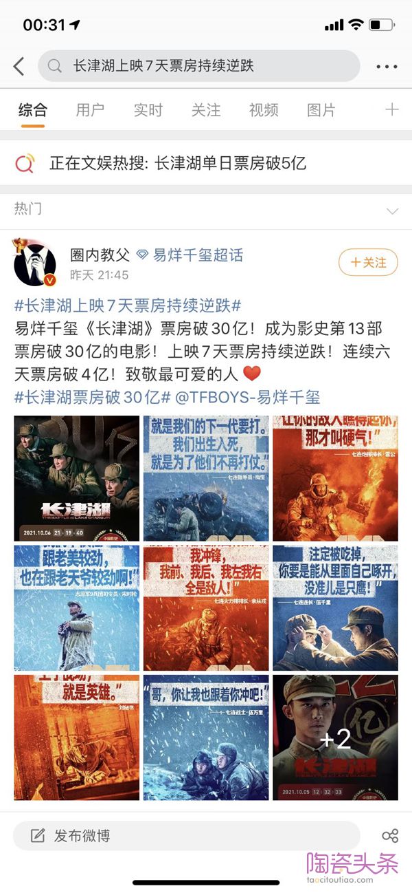 上映11天,票房就破40億,被網(wǎng)友評為值得二刷三刷的電影——《長津湖》位列中國影史票房榜第7位,成為國慶檔票房冠軍,微博熱榜甚至用“逆跌”這個(gè)詞來形容《長津湖》的票房。