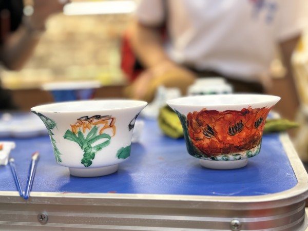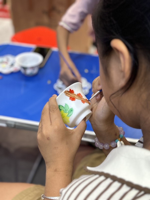 現(xiàn)場(chǎng),曾燕寶老師,以德化白瓷為載體,親身示范,在蓋碗上手繪了一朵動(dòng)人的牡丹花,并詳細(xì)講解了陶瓷手繪的技巧和要點(diǎn),包括顏料的選擇、筆觸的運(yùn)用、色彩的搭配等。她鼓勵(lì)小朋友們發(fā)揮自己的想象力和創(chuàng)造力,繪制出屬于自己的陶瓷作品。在曾老師的指導(dǎo)下,小朋友們紛紛拿起畫(huà)筆,開(kāi)始了自己的創(chuàng)作之旅。