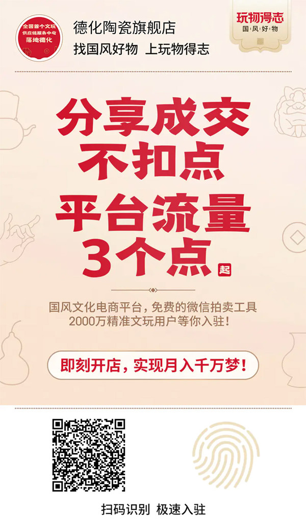 此次,玩物得志全國(guó)首個(gè)文玩供應(yīng)鏈服務(wù)中心落地德化,將和德化縣政府、中瓷網(wǎng)絡(luò)產(chǎn)業(yè)互聯(lián)網(wǎng)平臺(tái)一起建設(shè)德化縣的綜合電商能力,共同為“千年瓷都”注入新血液,建立與新消費(fèi)市場(chǎng)相匹配的運(yùn)營(yíng)模式,助力商家打造契合流量時(shí)代的產(chǎn)品、標(biāo)準(zhǔn)化的電商服務(wù)及全方位的整合營(yíng)銷(xiāo),提升當(dāng)?shù)靥沾僧a(chǎn)業(yè)知名度與影響力。