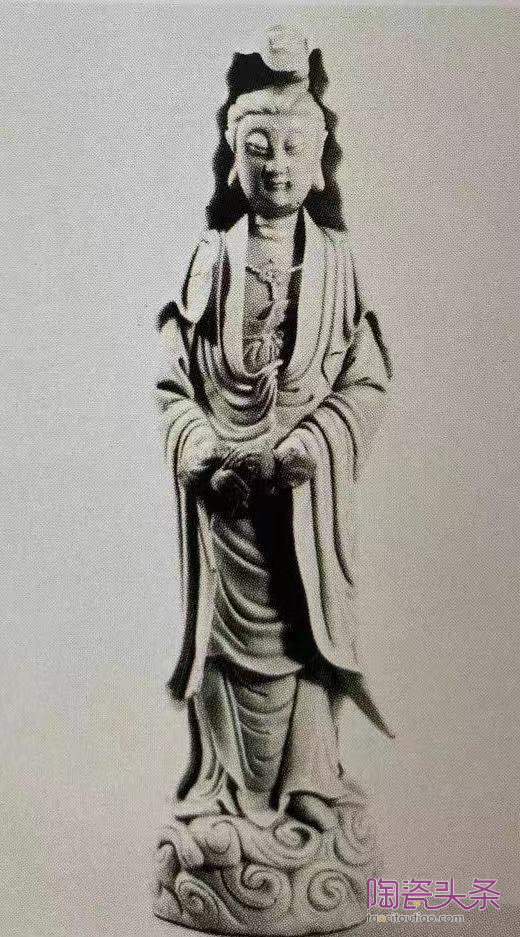 在同一個(gè)展覽中的一個(gè)高大的觀音立像也有何朝宗的標(biāo)記(圖22)。這是另一件具有紀(jì)念意義的作品,觀音超過(guò)20英寸高,穿著白袍和披著斗篷站在海邊的巖石上。一只腳露了出來(lái),但是雙手卻藏了起來(lái),緊扣在被微風(fēng)輕輕吹動(dòng)的長(zhǎng)袍的長(zhǎng)袖里。在某些方面,這個(gè)瓷塑在雕刻上甚至比文昌的模型更加令人印象深刻,而且在處理上也肯定更加復(fù)雜——比如頭發(fā)和頭飾,或者精致的波浪。