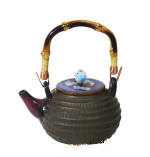 在茶臺(tái)前甫一坐定,李建峰大師就拿出一把壺放在記者面前。只看了一眼這把壺,記者便怦然心動(dòng),突然想起王菲演唱的《傳奇》:只是因?yàn)樵谌巳褐卸? 看了你一眼,再也沒(méi)能忘掉你容顏……這把壺造型古樸端莊,壺體呈灰黑色,上有玄紋環(huán)繞,玄紋間用跳刀技術(shù)過(guò)渡;壺嘴、壺蓋施鈞釉,瑰麗繽紛的窯變釉色與古 樸雅致的壺體形成夢(mèng)幻般的組合。壺的提手用南方毛竹做成,雅致而靈動(dòng)。綜觀此壺,既有鐵壺金屬般的質(zhì)感,又詮釋了鈞瓷的窯變特色,還凸顯了紫砂壺的裝飾風(fēng) 格與細(xì)膩工藝。與傳統(tǒng)的鈞瓷壺相比,其顯得質(zhì)樸、高貴、靈動(dòng)、典雅,視覺(jué)沖擊力更強(qiáng),更讓人過(guò)目不忘、愛(ài)不釋手。