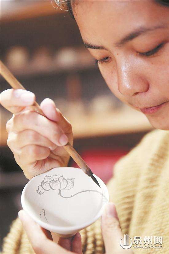 陶瓷繪圖,異于平面作畫,依據弧度順勢而為,更要小心是否粗細得當、濃淡相宜。