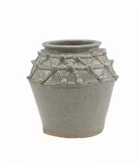 越窯繩索紋青瓷罐敞口、寬沿、斜肩、鼓腹下腹內(nèi)收。器物高17.6、口徑11.1、底徑11.6厘米。如果說到特殊之處,則在于它的紋飾。你會看到,它的肩至上腹部貼刻有繩索紋,上有凸起的繩索結(jié)鈕,通體施青綠色釉,近底部露胎。