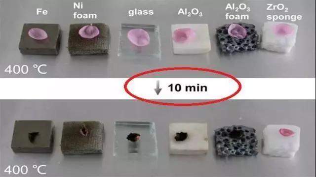 為了測試它們的耐熱性,研究人員將花瓣放置到不同的材料上,比如鐵、氧化鋁泡沫以及新型氧化鋯陶瓷海綿等。頂部的發(fā)熱體將其加熱至752度,10分鐘后,鐵、氧化鋁泡沫等材料上的花瓣都變得松脆。而氧化鋯陶瓷海綿上的花瓣只是變得有點枯萎,并且一小時之后,海綿頂部的溫度僅有200度,展現(xiàn)了很好的耐熱性能。